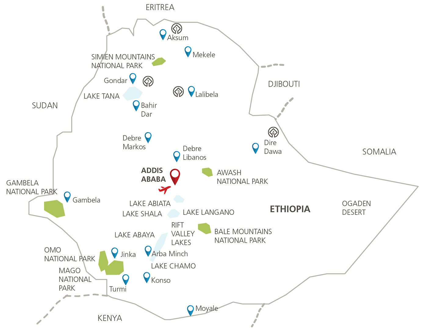 Ethiopia, in the Horn of Africa, is a rugged, landlocked country split by the Great Rift Valley. With archaeological finds dating back more than 3 million years, it’s a place of ancient culture. Among its important sites are Lalibela with its rock-cut Christian churches from the 12th–13th centuries. Aksum is the ruins of an ancient city with obelisks, tombs, castles and Our Lady Mary of Zion church.