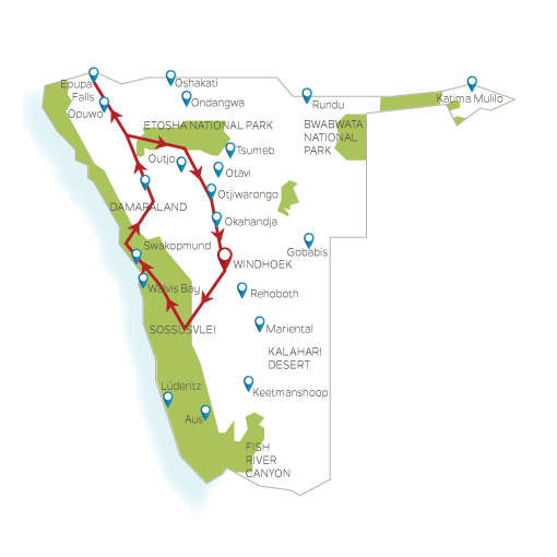 An Adventure filled Namibian Safari. This exciting adventure takes you into the heart of remote areas. You will experience contrasting landscapes including the majestic mountain ranges in Damaraland mixed with the vibrant cultures of Kaokoland and the amazing wildlife in the Etosha National Park and conservancies. This safari will leave you captivated with Namibia.